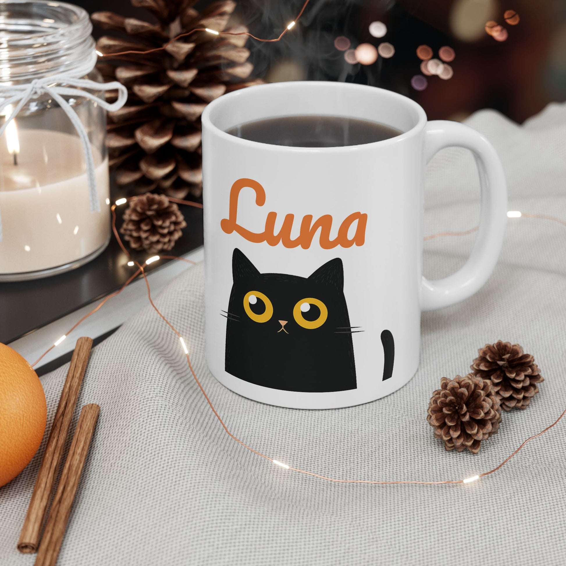 cat mug, personalized cat mug, black cat coffee mug, custom cat name mug, cute cat cartoon cup, cat mom gift, cat dad gift, luna cat mug, pet lover mug, cat lover gift idea, funny cat mug, coffee mug with cat design